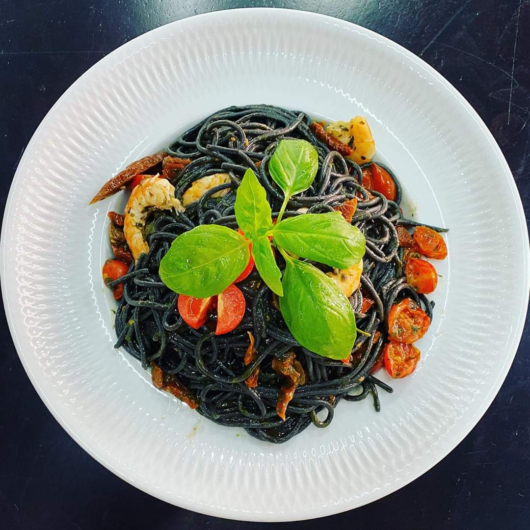 SPAGHETTI NERO COM CAMARÃO, TOMATE CHERRY, TOMATE SECO, SALSA E Q.B. PICANTE Spaghetti nero con gamberi, pomodorini, pomodori secchi, prezzemolo e peperoncino -